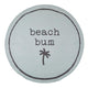 - LIGHT GREY COLOR: Dark Grey typestyle print with matching palm tree icon; reads "Beach Bum"