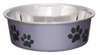 Details: This small grape purple stainless steel dog food and water bowl has a no-tip, no-skid design that prevents spills, making a Bella Bowl the perfect dish for your furry friend. These bowls are designed to be both functional and stylish. Whether you use it for dry or canned food or water, both you and your pet will enjoy the design and function of these bowls. Your pets mean the world to you, which is why these bowls are of the highest quality. They feature a revolutionary, patented and award-winning design. No matter which size or color option you choose, you'll bring the bestselling bowl in the pet industry into your home. Since your dog bowls likely sit out between meals, ensure they work well with your decor. Available in an array of sophisticated shades, Loving Pets Bella Bowls can complement any aesthetic with an expanding range of metallic colors. The paw print adds a decorative element and finishing touch, making these bowls just what you're looking for. Along with offering a stylish appearance, these bowls provide exceptional durability. They are built to last with an interior made out of stainless steel and an attractive polished poly-resin exterior. Each Loving Pets Bella Bowl features a removable soy-based rubber ring. If your dog has a habit of nosing their food or water bowl around, this rubber base will help keep the bowl in place instead of sliding their meal all around your home. The no-skid dog bowl design also helps prevent spills and noise during mealtimes. These vet-recommended stainless steel bowls are also dishwasher safe, making it easier than ever to keep your pet's food or water bowls clean and hygienic. The design doesn't hold odors and is rust-resistant, making it an excellent alternative to plastic. Remove the rubber base and toss the bowl in the dishwasher, reducing your daily cleanup time.